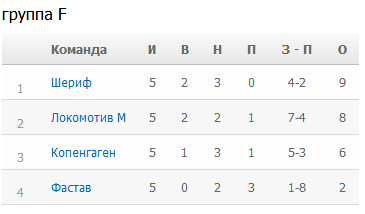 - Любопытное равенство очков у трех команд при победе «Копенгагена» и ничьей «Локомотива» в Чехии. При таком раскладе 3 команды имеют также и равенство по очкам в личных встречах – по 5. Придется считать разницу голов. На данный момент у «Шерифа» - 3:2, «Локомотива» - 4:4, «Копенгагена» 1:2. Вариантов очень много, но можно сказать с уверенностью, что «Шериф» вылетит, если проиграет с разницей в 2 гола. Москвичи не пройдут дальше, если «Копенгаген» победит в 1 мяч, забив при этом минимум 4 гола. «Копенгаген» вылетит, если победит со счетом 1:0, 2:1 или 3:2.