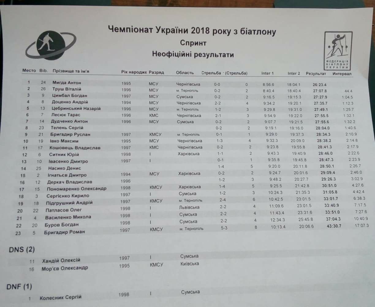 Сегодня в Яворове стартовал чемпионат Украины по биатлону. Результаты мужского спринта: