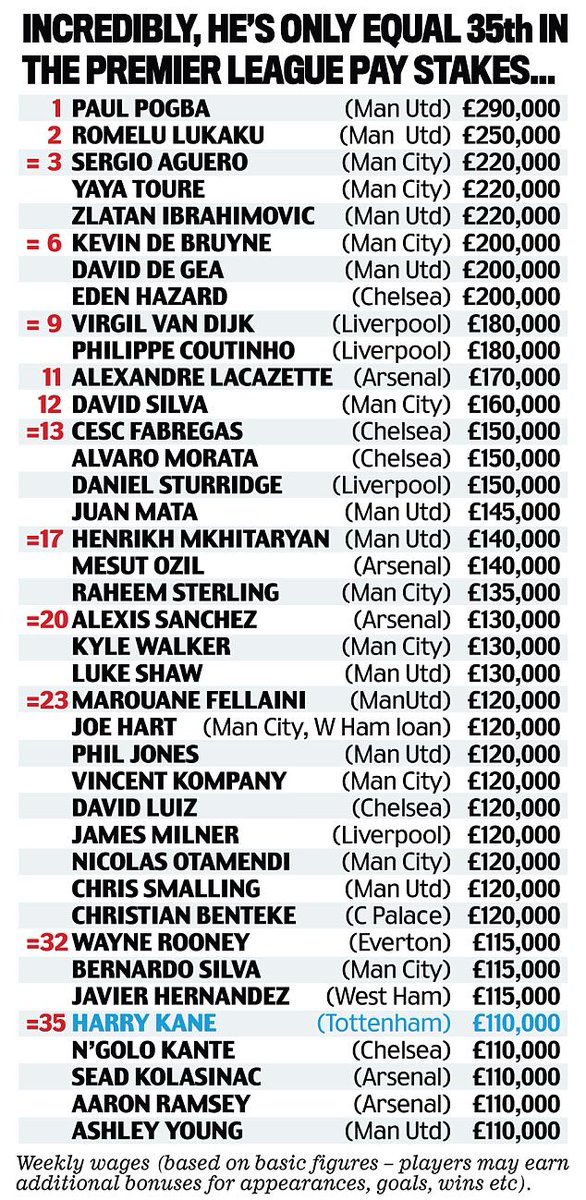 Нападающий «Тоттенхэма» Гарри Кэйн занимает лишь 35 место в списке самых высокооплачиваемых игроков АПЛ. Его недельный оклад ровняется 110 тысяч фунтов (124 тыс. евро).