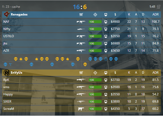 Дальше встретились австралийцы и французы, картой для встречи стала de_cache. Пистолетный раунд для EnVyUs, который перешёл во второй, после которого атака взяла свое, 1-2. После чего защита отдала 4 розыгрыша, и взяла только один, 5-3. Смогли французские парни пощать удобный минимум в первой половине, 10-5. Вторая пистолетка стала идеальной террористической акцией, и сразу ответка от защиты, 11-6. В последствии два форсированных раунда, которые остались за Renegades, 13-6. Оружейные, форсированные раунды, - все это не помогло пробить защиту коллектива из Австралии, 16-6.