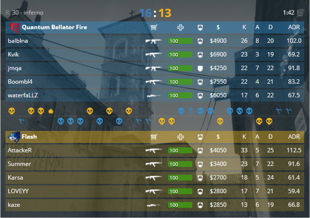 Карта номер 5 состоялась между Flash Gaming и Quantum Bellator Fire, локация для противостояния, - de_inferno. Легкая и красивая пистолетная атака, которая досталась коллективу QB.Fire, 0-1. Быстрая ответка форсированным байем, 1-1. Серию от террористов в три раунда была прервана защитной, счёт 4-4. Очень быстрые раунды начинают ставать просто бешеными, в результате, - качельные 8-7. Вторая пистолетка падает в копилку китайскому коллективу, счёт 9-7. Закупы и размены раундами, с пушем банана, защита выходит вперёд, 11-12. Финальная стадия встречи прошла под диктовку «месье рандома», непонятные раунды в копилку, клатчи, и счёт встречи, - 16-13 для QB.Fire.