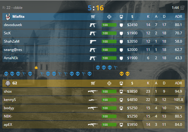 Заключительная серия бест оф 1 стала игра G2 против Misfits, локация встречи: de_cbblestone. Команда из Франции начинает в защите, легко забрав первый раунд. Фарм на форс бай во втором раунде приносит второй пункт в копилку защиты, а затем и эко раунд от атаки, 3-0. Два оружейных не изменили ситуацию, безыдейная игра от американцев, 5-0. Отличный пуш «А» через «дропрум», и серия раундов в ответ, 8-1. Неплохая атака «В» через стену дымов, однако удержать не получилось, 9 для защиты. Разбиваются о скалы все попытки зайти на точку от атаки, 14-1. Вторая пистолетка становится возможностью для возвращения в этом поединке, 14-2, и фулл эко, - 14-3. Рофл моменты от французов в 18 раунде, пуш длинны на «В», 14-4. Размен ошибками от команд по обе стороны баррикад, 15-5. Валидольный раунд становится последним в этом матче, 16-5 для пятёрки из Франции.
