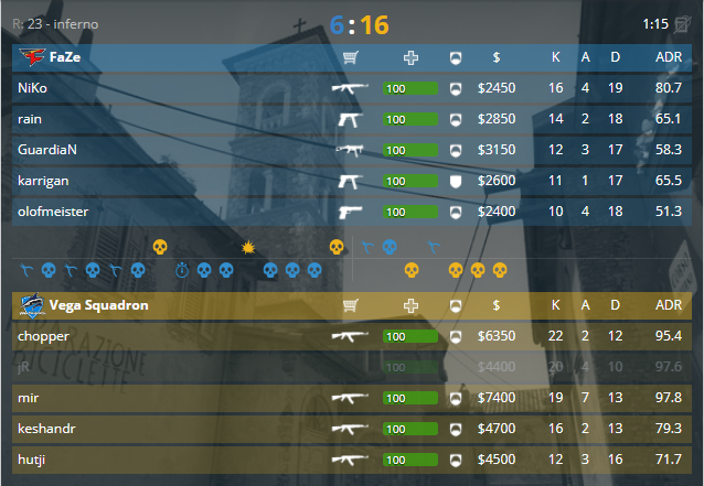 Встреча фаворита и андердога турнира, Faze Clan против Vega Squadron, на маппике коллективы выбрали de_inferno. «Акулы» начинают пистолетку в защите, и забирают первый раунд. После чего, в разменах игроками, забирают второй, третий и четвёртый, 4-0 за Vega. Доминация защиты продолжается, однако «фаст пуш банана» в седьмом принёс плоды, 6-1. Характер СНГ-команды заставляет задуматься противников, но и это не помогает, счёт 9-1. Размен раундами, увозите «галактикос», они сломались, счёт 11-2. Полная аннигиляция атаки от Vega Squadron, 12-3. Вторая половина началась пистолетным раундом для «фейзов», 12-4. Серия форсированных для коллективов, счёт 13-5. Нестандартная игра от атаки позволяет сбить экономику защиты и набрать, 15-6. Не имея экономики, Faze не смогли сделать камбэк, и это ГГ, 16-6 для Vega Squadron