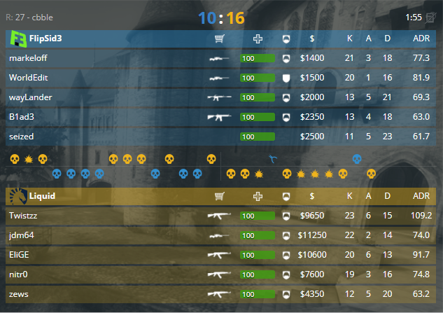 Начало осталось за Flipside Tactics и Team Liquid. Парни сыграли на карте de_cbble. Пистолетный и два следующих раунда уходят Blade и ко. Первый оружейный раунд ушел в копилку американского коллектива, 3-1. Еще один закуп от атаки не приносит результата, как и эко, 3-3. Защита забирает еще один раунд, а следующий на легком форсе забирает атака, 4-4. Атака нашла ключ к обороне плэнта «Б», но не долго он работал, 6-5. Непонятный 13 раунд от атаки, - забрав предыдущий, отдали розыгрыш не забрав никого, 7-6. Размен раундами, и 8-7 для СНГ-команды. Вторая пистолетка залетела для «жидких», после которой коллектив начал укреплять экономику, 11-9. Серия розыгрышей для атаки не оставляют шансов коллективу в защите, 16-10.
