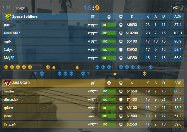 Интересная пара сошлась в рамках турнира: Space Soldiers и AVANGAR. Пистолетка на карте de_mirage ушел в копилку «космических солдат», 1-0. Ошеломляющая атака от пятёрки из Турции, 5-0. Попытки как-то перевернуть игру от СНГ-команды не принесли большого дохода, взяв 2, также 2 отдали, 2-7. В десятом раунде был набран номер «камбечной», после которого защита взяла серию из трёх, 5-7. Дальше размен раундами и отсутствие экономики для атаки в последнем раунде первой половины, 8-7. Пистолеты второй половины ушли турками, 9-7. Два фарм-розыгрыши от защиты, 11-7. Очередной размен от оппонентов, 12-8, однако, защита прижимала все попытки что-нибудь предпринять, 16-9.