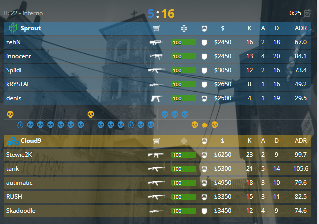 «Облачные» встретились со «спрутами», случилось это на карте de_inferno. В защите пистолетный раунд начали американцы, однако не взяли, 0-1. Сразу же форс и оружейные раунды, которые приносит 3 раунда для С9, 3-1. Атака безотказно пытается взять точку «В», разбиваясь о скалы стороны «дифенса», 7-1. Только в 9 раунде атака смогла преодолеть защитные редуты, и после сразу отдала серию, 13-2. Пистолетный раунд второй половины начался с «пуш банана», который защита смогла выстоять, 13-3. Стандартная серия начала половины, и защита укрепляет экономику, 13-5. Первый оружейный и Cloud9 возвращаются в игру, 14-5. На легкой руке играют парни из Северной Америки, победа в матче со счётом 16-5.