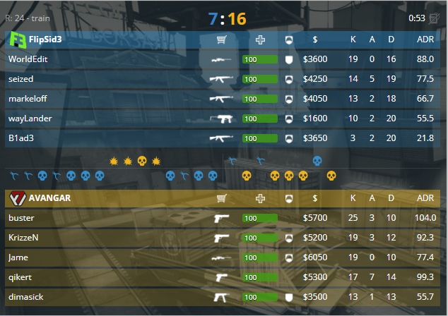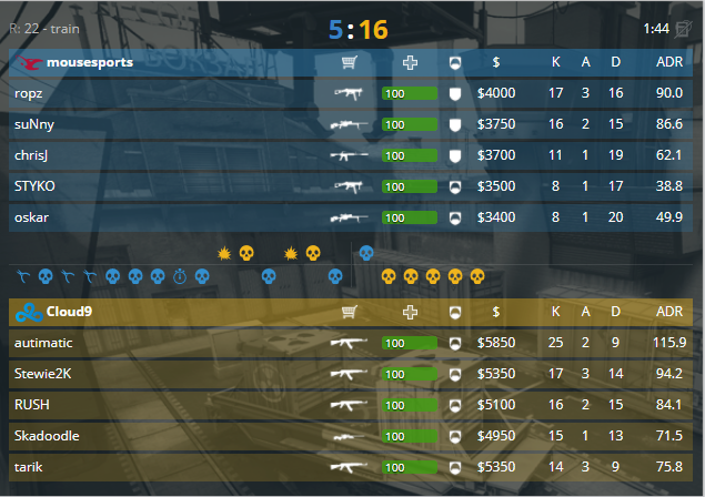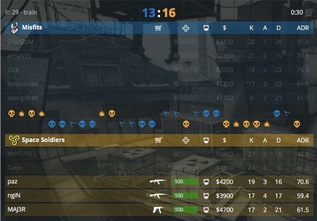 Картой номер три стала de_train, на которой сыграли Misfits и Space Soldiers. Стоит отметить, что это первые «поезда» за последние дни. Сильная атака от американцев позволяет забрать пистолетный, а за ним раунды начальной серии, 3-0. Оружейный так же за атакой, однако следующий «фаст В» сыграл плохую шутку с американской пятёркой, 4-1. В последствии розыгрыши только для защиты, 5-4. Раунд №10 стал «вторым дыханием» для атаки на два выхода к «плэнту», а дальше два для команды защиты, 7-6. Первая половина уходит «космическим солдатам» 9-6. Вторая пистолетка дает возможность Misfits вернутся в игру, 9-8. На карте первый оружейный от коллективов ушел атаке, однако ответочка была мгновенной, 10-11. Очередной размен, и раунд от «засейвленных» девайсов, 13-11. Плохой закуп от защиты, а после легкий форс не приносят плодов, 15-11. Разбиваются о вагоны игроки атаки на закрытой точке, 15-13. Сумбурный раунд №29 все же уходит турецкой пятёрке, 16-13.