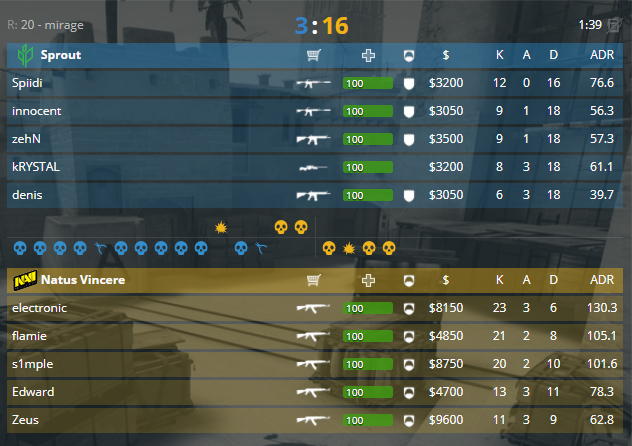 А на сцене уже готовятся к игре коллективы Sprout и Natus Vincere, встреча будет проходить на локации de_mirage. Интересные раунды от желто-чёрных приносят им преимущество в количестве четырёх пунктов, 4-0. Продолжается доминация защиты на карте, 7-0. Просто не заходит игра «спрутам» в атаке, 10-0. 11 раунд стал первым для атаки, но, пока что, единственным, защита забирает два следующих, 12-1. Первая половина закончилась под диктовку атаки 12-3. Второй пистолетный раунд на тоненького для игроков NaVi, 13-3. Разорванная экономика не дала возможности как-то противостоять атаке, счёт встречи 16-3.