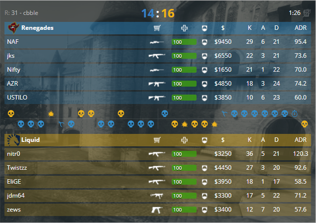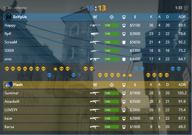 Следующая пара парни из Франции и Китая, локация после пикобана: de_inferno. Первый матч за вылет начался пистолетным раундом для атаки (EnVyUs), 1-0. Серия раундов на легкой руке уходит атаке, не давая возможности наладить экономику защите, 6-0. Команды по очереди забирают в свой актив раунды, 8-1. Еще два раунда для атаки, и стоп – кран в 12 раунде от Attacker’a, 10-2. Не смогли сделать мини камбэк китайцы, 12-3. Задавила атака, забрав начальные раунды, 12-6. Совершается звонок в камбэчную, и защита отдает раунд за раундом, 12-9. Только в 22 раунде Rpk и компания смогли остановить оппонентов, 13-9. Финальная стадия встречи стала проходит под диктовку атаки, 14-13. Уже была уверенность, что «камбэк из риал», но защита смогла удержать нужные им раунды, 16-13.