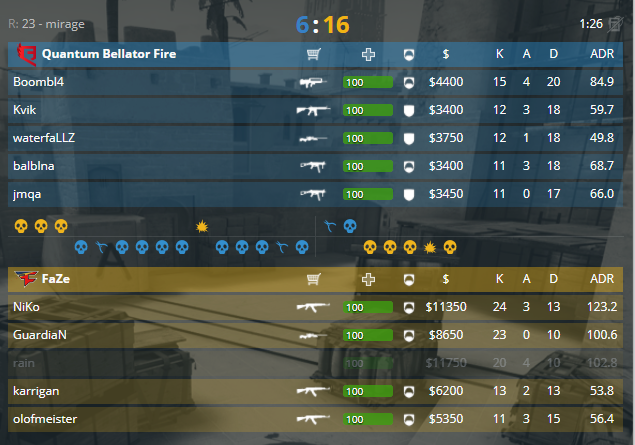 Первый матч состоялся между Faze Clan и QB.Fire на карте de_mirage. Пистолетный раунд и серия после него ушли стороне атаки, за которую играют Quantum, 0-3. Начиная с первого оружейного раунда «галактикос» начинают возвращаться в игру, 3-3. Ничего не выходит в атакующей команды, защита ловит на ошибках, 6-3. Отличный раунд номер 10, красивая игра от снайпера СНГ-команды, 6-4. Доминация защиты не оставляет шансов набрать удобный минимум оппонентам, 11-4. Второй пистолетный не отдали «фейзам», 11-5. Размен раундами для коллективов, 12-6, двойное преимущество для атаки. Не получается контрить атаку F.Clan, счёт встречи 16-6.