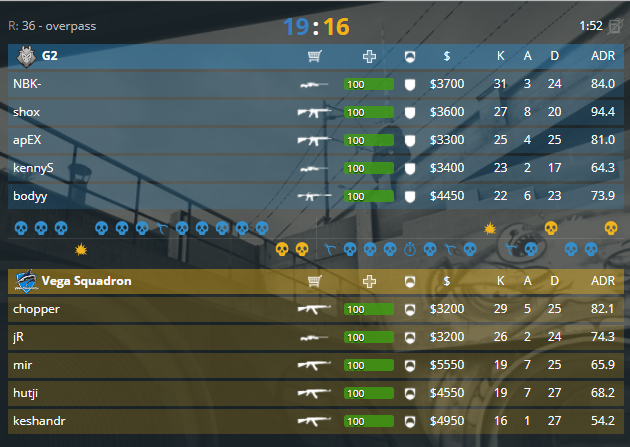 Следующая команда стала сенсацией второго игрового дня, Vega Squadron сыграют против G2. Первый раунд на de_overpass ушел стороне защиты, после чего EnVyUs забирают следующие пару раундов, 0-3. Оружейный начался с минуса на «токсике» от атаки, после чего защита не смогла зайти, 1-3. Немножко не хватает атаке чтобы добрать раунды в копилку, 1-7. Доминация переходит в неприличные рамки, 1-11. Концовка все-таки прошла за «акулами» отдав 12, он забрали еще 2, 3-12. Вторая пистолетка началась с быстрого пуша точки «В», и качественного выбивания, 4-12. Теперь защита от Vega не дает атаке сделать что-то на карте, 8-12, парни из СНГ возвращаются в игру. Нереальное исполнение от Chopper`a и ко в «дефенсе», 11-12. Первый раунд для атаки случился только в 24 раунде, 11-13. А дальше закрытая защита, и «камбэк из риал» команды выходят на равный счёт, 13-13. Отдав 27 раунд, защита имеет раунд судьбы в 28, в жесточайшем раунде защита тащит, 14-14. Форс в атаке с надеждой взять 15, и это мачт поинт для «акул», 15-14. Истории золушки так и не случилось, нас ожидают первые дополнительные раунды, 15-15. Сильная, безошибочная, игра от французов в первых дополнительных, 15-18. После смены сторон атака начала с позитива для себя, 16-18. Однако, в следующем раунде, не смогли занять позиции, и отдали раунд, счёт встречи 16-19 для G2.