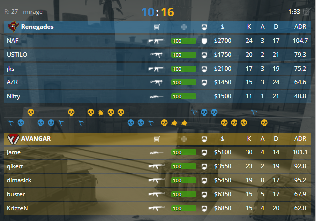 А дальше AVANGAR и Renegades будут решать, кто же сыграет с «ликвидами» за последний, «девятый» слот на мажор. Данная ситуация сложилась из-за коллектива, который отказался от участия в турнире. Еще один de_mirage для коллективов в предпоследней игре четвёртого дня. Казахи начинают матч за сторону защиты, отличное выбивание, 1-0. Австралийцы не собираются далеко отпускать противников, 2-1. Лобовая атака точки «А» не приносит дивидендов, 4-1. Красивая игра и в атаке, и в обороне, 6-3. Возвращаются «шерифы», показывая близкую игру, 6-6. Три раунда к ряду, и первая половина уходит казахам, 9-6. Второй «пистол кинг» и серия начала стороны за казахской командой, 12-6. Защита отыгрывает серию из 3 раундов, и те же 3 отдают оппонентам, 15-9. В 25 раунде игроки в защите имеют легкий бай, и забирают клатч 1 в 4 с фулл закупом, 15-10. Плотный заход на точку «А», который не получается законтрить, счёт встречи 16-10.