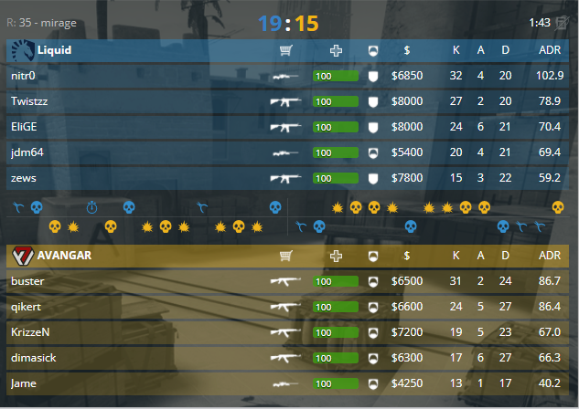 Последний матч дня, - Team Liquid против AVANGAR, в этот раз стадия пиков-банов закончилась выбором карты de_mirage, «жидкие» выбирают сторону защиты. Минимальная ошибка для атаки принесла первый для защиты, 1-0. Не хотят коллективы отдавать преимущество, ведут ожесточённая война за каждый раунд, 4-4. Качественная, здоровая конкуренция на карте позволяет смотреть красивые раунды, 6-9, первая сторона за СНГ-коллективом. Второй пистолетный и форс раунды заходят для казахов, 6-11. Распечатали американцы оборону несколько раз к ряду, 10-11. Не получается качественно задефать атаку, счёт 14-12, парни из Америки вернулись в игру. Не остаётся экономики у защиты, которой хватит только на легкий армор и «цезешки», при этом парни берут раунд, 14-13. В окончании матч просто неадекватные раунды в исполнении коллективов, 14-15. Остается последний раунд для казахов, либо же дополнительные, смотрим. Серия ошибок в защите, и это дополнительные, 15-15. Сыпется защита от раунда к раунду, легкая серия для «ликвид», 18-15. Смена сторон не помогла вернутся в игру AVANGAR`aм, последним участником турнира становится Team Liquid, 19-15.