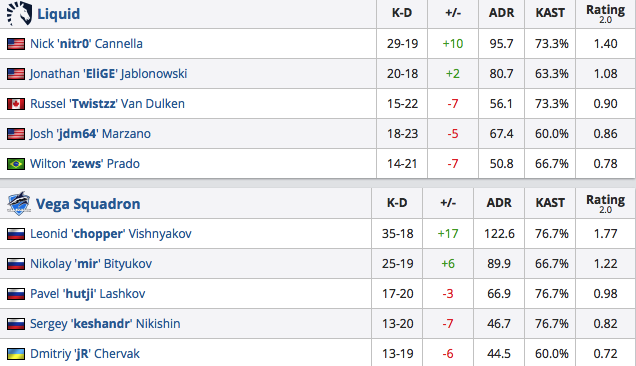 Второй картой стала de_mirage, а коллективами, что сыграли на ней, Vega Squadron и Team Liquid. Американцы лишь почти без потерь берут первую пистолетку, но защита справляется с форс-баем оппонентов. Vega Squadron уверенно выходит вперед, 3-1. Восстановив экономику, американский коллектив сравнивает счет и начинает показывать хорошую игру в защите,6-3. После продолжительной технической паузы коллектив из СНГ возвращается в игру и забирает первую половину со счетом 9-6. Вторая пистолетка стала нереальным ретейком от «акул» в защите, 10-6. Не долго музыка играла, и команда в обороне отдает свои форс байи, 10-8. Не получается задефать атаку, еще два раунда и паритет в матче, 10-10. Спам одного раунда приносит преимущество для атаки, 10-12. Размен раундами для команд, 11-13. Очень крутой форс от защиты, потеряв только одного, Vega забирает поинт, 12-13. Очередной близкий размен раундами, 13-14. Отдав 14-ый для защиты, «жидкие» делают форсированный и матч поинт и нет денег для коллектива в атаке, 15-14. И «акулы» тащат эту игру!!!! Счёт встречи 16-14, и парни проходят в групповую стадию.