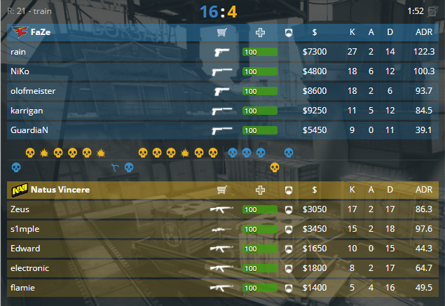 Дальше нас ожидает безумная заруба нереально сильных исполнителей, - Faze Clan против Natus Vincere, карта для парней: de_train, сторона СТ для желто-чёрных. В пистолетном раунде защита показывает хороший «аим», 0-1. Форсированные диглы от атаки дают фору форсу от защиты, 1-1. Не заходит пока игра для Zeus и компании, 6-1. Неожиданный раунд для защиты в 8 раунде этого матча, 6-2. Казалось началось возвращение защиты, однако атака давит, 8-3 первая половина уже за «галактикос». Завезли «фейзы» безапелляционную доминацию на карту поездов, 12-3. Вторая пистолетка становится началом конца для СНГ-коллектива, 13-3. Не оправдали команды ожидания равной борьбы, очередной салат, 16-4. Faze Clan становятся еще одним участником группового этапа.