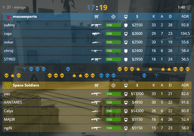 Переходим к следующей встречи, а это Space Soldiers и Mousesports. Турки будут играть против немцев на de_mirage. Space начинают в атаке, и к ним нет вопросов, - легкие 3-0. Перехватывают инициативу игроки обороны, 3-3. Близкая игра проходит на локации с обеих сторон, выливается в красивые раунды, 6-5. Образцовая атака от «космических солдат» выливается в преимущество, 10-5. Вторая пистолетная дуэль коллективов заканчивается для турецкой пятёрки, 11-5. Забирает оборона начальную серию, смотрим оружейный, который все-таки забираю «мышки», 13-6. Первая нажатая красная кнопка, атака начинает набирать обороты, 13-9. Но при этом защита говорит «нет», и разменивают розыгрыши, 14-10. Взяв 15 в защите, парни немного расслабились, и отдали 26 и 27 раунды, 15-12. Остаются последние раунды, которые забираю Mousesports, 15-14. Будем ли мы наблюдать допы на этой карте? Да, мы их увидим, камбэкнула атака в эту игру, 15-15. Оборона начинает агрессивно, но проигрывает клатч 3 в 1, 15-16. Разозлили игроки атаки оппонентов, и получили непроходную стену, и мгновенная ответочка, 16-17. Сильный раунд в атаке уже от солдат, 17-17. На тоненького уходит еще один раунд для атаки, 18-17, - матчпоинт для коллектива из Турции. Три AWP в атаке, показывают парни интересную заготовочку, и забирают раунд и матч, 19-17.