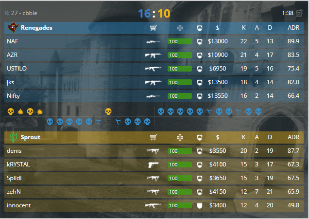 А на сцене уже готовятся к своему противостоянию австралийцы и немцы, Renegades и Sprout сыграют на карте de_cobblestone. Начало карты «драгонлора» полностью за австралийцами, 4-0. Переиграли сами себя игроки атаки, и начинают отдавать раунды оппонентам, 4-4, камбэк оформлен. После серии в 6 раундов, атака в долгом пути к «В» все же забирает пункт в свою копилку, 5-6. Раунд суеты состоялся от коллективов, в результате, 1 в 2 для защиты, 5-7. Заключительная часть первой половины проходит под диктовку «спрутов», 5-10. Смогла с собой совладать австралийская пятёрка в начале второй половины, 8-10. Смотрим первый оружейный, ошибка в дропруме с выпавшей бомбой, 9-10. Фаст пуш с пистолетами на точку «В» не приносит дивидендов, временная ничья, 10-10. Железобетонная игра в защите от опорников все той же точки «В», 14-10. Доминация защиты по все карте не оставляет шансов, счёт встречи 16-10.