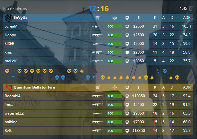 Последняя игра первого круга состоится между EnVyUs и QB.Fire, локацией стала de_inferno, стоить отметить, что проигравшая команда покинет турнир. Французы начинают за сторону атаки, быстрый заход на точку «В» и неудавшееся выбивание, 1-0. Отличный ответный форс от защиты, 1-1. Нереальная игра от парней на т-сайде, 3-1. Быстрая, уверенная игра от Scream`a и его команды, 6-1. Очередной оружейный от защиты, не приносит каких-то доходов, 7-1. Агрессивная игра на миду от защиты, наконец-то парни добывают второй для себя, 7-2. Размениваются раундами команды, 8-3 и первая половина за Team EnVyUs. Основательная атака захватывает большинство раундов, 10-3. Шикарнейший шифрованный раунд от защите на уничтожение оппонентов в мидле два раунда под ряд, 10-5. Рабочий счёт для СНГ-коллектива, пистолетка становится тихим ужасом для защиты, 10-6. Начальная стадия и первый оружейный поддаются игрокам атаки, и временный паритет, 10-10. Беспрерывная серия от атаки не оставляет шансов тренеру и игрокам пятёрки из Франции, 10-13. Отметим, что за французов не играет Rpk, из-за состояния здоровья, заменой стал тренер коллектива, - Malek. Будучи в шаге от окончания карты, QB отдают раунд в атаке, 12-14. Взяв следующий раунд, Quantum получили 3 матчпоинта, 12-15. Атака ковры не выбивается, победа для СНГ-коллектива, 12-16. Ждем жеребьёвку.