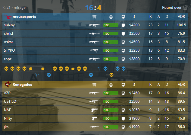 Первой сыграют пара Renegades и Mousesports, картой данного противостояния станет de_mirage. Немцы начинают в атаке и забирают первый раунд, 0-1. Ошибки от обороны позволяют атаке идти катком к победе, 0-5. Нестабильный раунд от атаки в два «AWP» не зашел, австралийцы размочили счёт, 1-5. Шахматный размен для команд, смотрим раунд за два, 2-7 для «мышек». Пытаются парни в обороне что-то предоставить в ответ атаке, однако те их переигрывают, 2-10. Доминируют «мауза», забирая большинство, 3-12. Второй пистолетный раунд вместе с форсированным раундом уходит новоиспечённой защите, 3-14. Первый оружейный забирает атака, будет ли камбэк, 4-14. Не отпускают «мышки» оппонента и выходят в групповой этап, легкая победа 4-16.