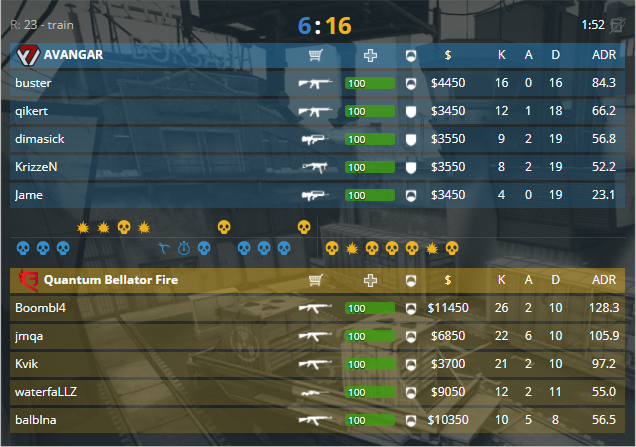 Дальше мы смотрим сумасшедшую встречу: AVANGAR против QB.Fire, картой для десятки стрелков стала de_train. «Кубы» начинают за оборону и забирают начальную стадию, 0-3. Первый оружейный остался за атакой, 1-3. Перехватывают казахи инициативу и забирают временную ничью, 3-3. Начинаются качели где между вагонов поездов, 5-6. Заканчивается половина под диктовку игроков защиты, 6-9. Вторая пистолетная стрелка была полностью перевёрнута атакой в меньшинстве, 6-10. Захватывают точку за точкой игроки атаки, не давая укрепить экономику обороне, 6-14. Ничего не могут сделать казахи со своими коллегами по цеху, 6-16, - QB.Fire проходят в групповую стадию данного турнира.
