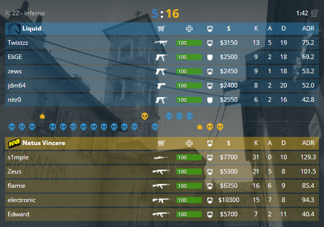Последнюю прямую путёвку разыграют между собой Natus Vincere и Team Liquid. Картографию изучать парни будут на de_inferno, за сторону защиты начнут NaVi. Пистолетный раунд закончился для атаки, не успев начаться, 1-0. Сразу же на карте двусторонний форс, и эко для атаки, 3-0. Сделали бартер раундами оппоненты, 4-1. Пытаются «жидкие» что-то предложить в замен защите, однако этого не достаточно, 8-1, - первая половина за украинской командой. Плотная игра от обороны, которая работает по всей карте, 11-1. Неприлично не везет американскому коллективу в атаке, парни забирают только пару раундов, 13-2. Пистолетная перестрелка второй половины стала моментом «де жа вю» относительно первой, 13-3. Начальная серия уходит защите, 13-5, ожидаем оружейный. Неописуемый эко-раунд от террористов с пистолетами, 14-5. Полная аннигиляция оппонентов от желто-чёрных, 15-5 и 16-5. Коллектив все-таки выходит в групповую стадию.
