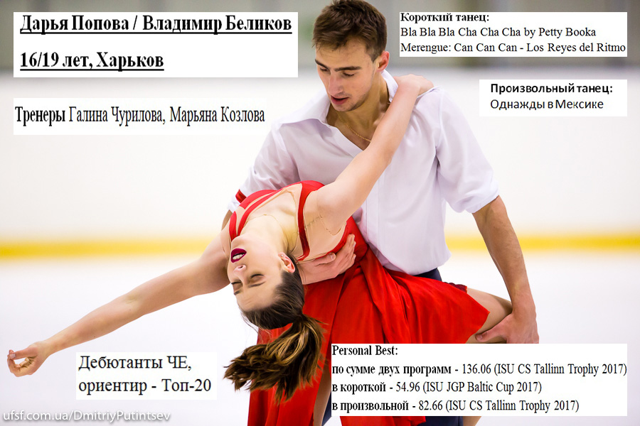 Для второй танцевальной пары Украины Дарьи Поповой и Владимира Беликова, которые проводят лишь второй совместный сезон и имеют за плечами только один крупный турнир (12-е место на ЮЧМ в Тайбэе-2017), главным будет справиться с присущим всем дебютантам волнением и отобраться в произвольную программу, в которую квалифицируются 20 дуэтов из 30.