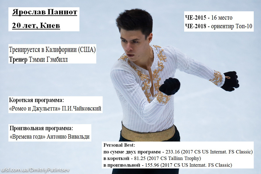 В прошлом году заветная десятка на еврофоруме закрылась на результате немца Пауля Фентца - 225,85. Ярослав Паниот в течении олимпийского сезона уже дважды превосходил эту сумму: один раз в сентябре на этапе серии «Челленджер» U.S. International Classic в Солт-Лейк-Сити (233,16), второй - на декабрьском чемпионате Украины в Киеве (234,06), где победив в борьбе с чемпионом страны последних двух лет Иваном Павловым, отстоял путевку на Олимпиаду-2018, добытую ранее им же самим на «Nebelhorn Trophy» в Германии. Так что не только теоретически, но и практически подопечному Тэмми Гэмбилл по силам сделать то, что его предшественникам не удавалось последние 17 лет (после бронзы Дмитрия Дмитренко в Вене-2000), то есть попасть в Топ-10.