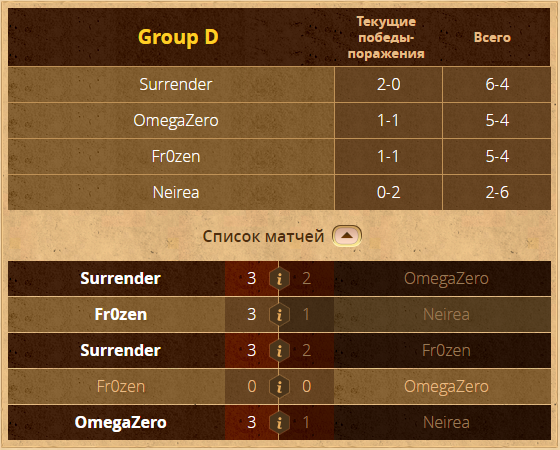 Дважды победить в группе D удалось Surrender'у, в очень напряжённых играх он одолел Fr0zen и Neirea, которого, позже, OmegaZero отправил последнего украинского игрока смотреть турнир как зрителя. Fr0zen сыграет против OmegaZero за возможность остаться на турнире.