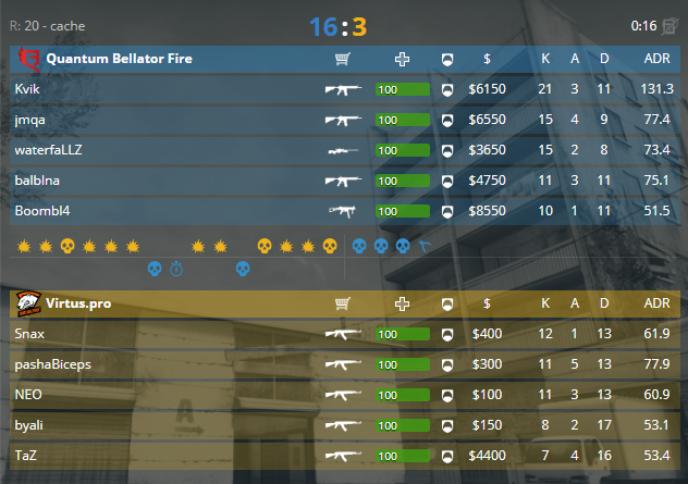 Второй парой стала встреча между Virtus.Pro и QB.Fire, картой данного противостояния была de_cache. Стартовав с пистолетного раунда Quantum Bellator захватывают преимущество, 0-6. Серия разменов раундами и тактические паузы, 3-9. В окончании половины «кубы» захватывают преимущество, 3-12. Забрав вторую пистолетку, СНГ-коллектив доживает «мишек», счёт 3-16.