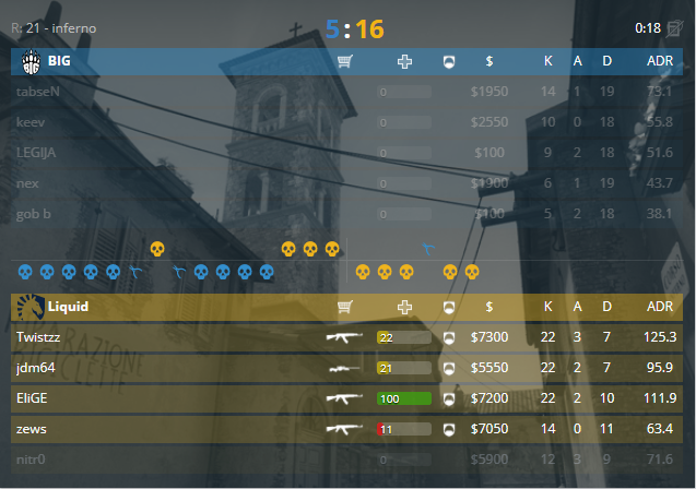 Третьей картой стала de_inferno, сыграли на ней американцы и немцы. Начало карты осталось за «жидкими», 6-0. Первым для BIG стал раунд под номером 7, счёт 6-1. Половина, в целом, прошла под диктовку Team Liquid, 11-4. Инициативу «ликвиды» отпускать не собираются, о чём свидетельствует набранное количество раундов, 14-5. Разваливаются парни в защите и отдают эту игру, счёт встречи, 16-5.