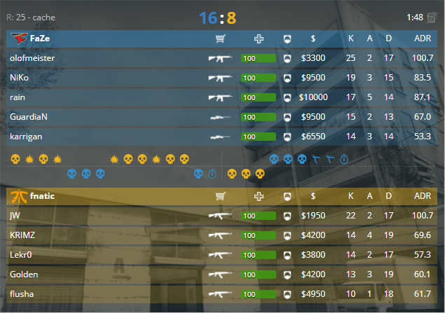 В ожидании качественной зарубы переходим к игре: Fnatic и Faze Clan. Сошлись парни на локации de_cache. Хорошее начало от «галактикос», парни укрепляются, 4-0. Обмен сериями раундов от пятёрок по разные стороны баррикад, 7-3. Продолжается диктовка своей игры от Faze, и удобный минимум для камбэка, 10-5. Начало второй половина за шведами, 10-8. Не понравился пыл, с которым начали догонять «фейзов», и парни забирают серию, 14-8. Не смогла атака зацепится за последний шанс в этой игре, 16-8.