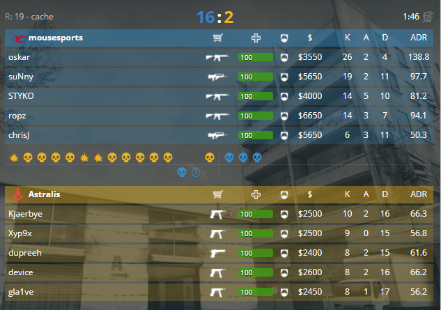 Вторую половину игрового дня открывали Astralis и Mousesports. На стадии выбора карты коллективы решили сыграть de_cache. Начиная за сторону защиты, датчане не смогли устоять против оппонента. «Мышки» выносят из первой половины максимум, 0-9. Только спустя 12 раундов датский коллектив берет пару, 2-13. Второй пистолетный раунд расставил все на свои места, счёт встречи 2-16.