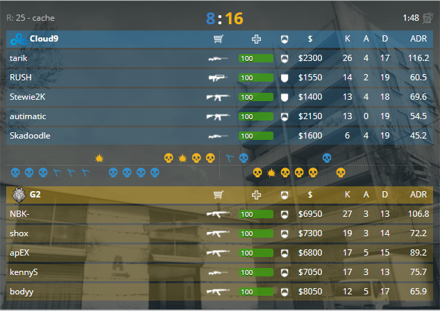 Следующий матч будет противостоянием претендентов на статус легенд, Cloud9 против G2. Очередной de_cache в стадии пиков – банов, за защиту начинают французы. В начале карты игра шла под диктовку последних, 0-6. Забрав один розыгрыш, атака разбилась о скалы еще несколько раз, 1-9. Выравнивают игру американцы, половина заканчивается со счётом 5-10. После начала в торой половины команды не отдают преимущество в руки противника, 7-13. Уронив экономику защиты, команда из Франции дожала противоположную пятёрку, 8-16.