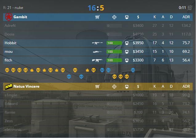 А следующим матчем стало супер СНГ-дерби, - Natus Vincere против Gambit Gaming. Сыграть команды решили карту de_nuke, первый на этом турнире. Сильное начало от казахского коллектива и беззубая защита, 0-5. Полная доминация атаки на карте и такая же рассинхронизация в защите, 0-10. Первая половина за казахами, безапелляционные 2-13. Начало второй половины не оставило шансы для желто-чёрных, 5-16.