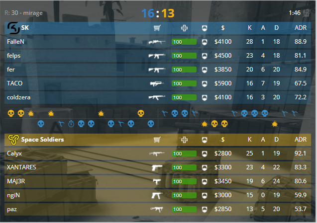Последняя карта дня, фаворит против андердога, SK Gaming против Space Soldiers, картой становится de_mirage. Турецкая пятёрка начинает в защите, пытаясь показать равную игру, 4-1. Очень равная игра в этом матчапе, 5-5. Очень плотная половина от турецкой команды, 6-9. Вторая половина начинается в бразильском темпе, 10-10. Пытаются турки удивлять своих друзей по ту сторону баррикад, 13-12. «Почувствовав кровь», бразильский хищник довел до логического окончания охоту, 16-13.