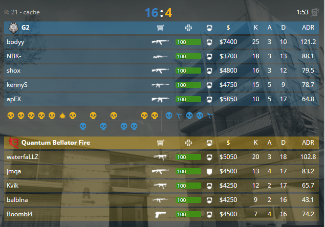 Следующая встреча, - андердогов против французов, QB.Fire против G2. За сторону атаки начинают французы на карте de_cache, 0-5. Не собираются парни из Франции отдавать путёвку в плей-офф стадию, 2-8. Питались обронить экономику оппонента игроки защиты, 4-11. Пистолетный раунд предрешил исход данной встречи, не смогли «кубы» обыграть противников, 4-16.