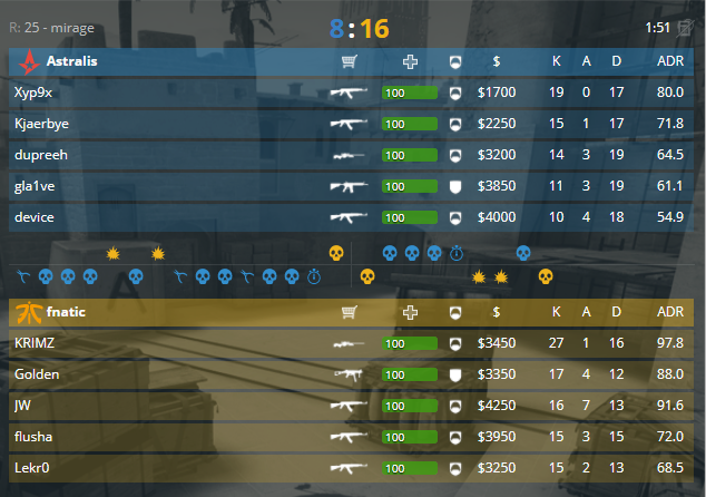 Игра под номером четыре, - шведы против датчан. Fnatic и Astralis сыграют на карте de_mirage. За оборону начинали парни из Швеции, и, уже стабильно на этом турнире, доминируют в начале карты, 4-1. Середина первой половины лучше проходит для шведской команды, 8-2. Заканчивали датские парни сторону со счётом, 12-3. Отдав пистолетный раунд, парни из Дании начинают камбэчить, 12-7. Набирают восемь матчпоинтов игроки защиты, и все один к победе для Fnatic, 15-7. Серия шифрованных раундов все же приносят результат, 16-8.