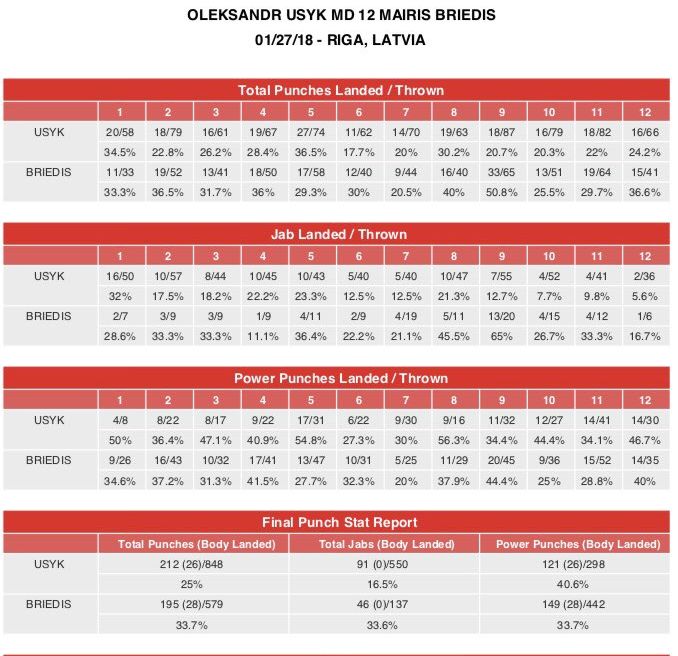 Как видно из статистики от CompuBox, Усик нанес больше ударов, чем его противник, но Бриедис выбросил на 144 силовых удара больше и нанес их немного больше, чем Усик. Украинский боксер активнее работал джэбом: 91 удар из 550 достиг цели против 46/137 у Бриедиса.