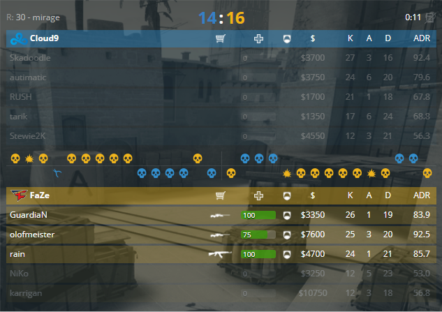 На первой карте, ей стала de_mirage, за сторону защиты будет начинать «клан», который не может нащупать начало игры, 1-4. Только в десятом раунде оборона смогла сказать: «закрыто», 2-8. Окончание первой половины стало продуктивным для защиты, 6-9. Равное начало второй половины приносит нам счёт 8-12. Не заходит игра за сторону обороны для «облачных», временная ничья, 12-12. Faze делают камбэк и набирают победный минимум, 15-12. Казалось бы, североамериканцы вернутся в игру, но olofmeister закрывает первую карту, 16-14.