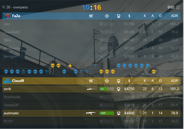 Переходим ко второй локации, выбор «фейзов», de_overpass. Хороший старт защиты от С9, сухая начальная серия, 0-5. Продолжают доминировать Cloud9, однако два раунда атака отжимает, 2-8. На морали зажимают «галактикос» игроки обороны, 3-12. Не получается rain’у и компании что-нибудь противопоставить злым янки, 5-15. Переворачивается с ног на голову игра, оборонные редуты становятся непроходимыми, 10-15. Додавили звёздную пятёрку американцы, 10-16. Счёт серии 1-1.