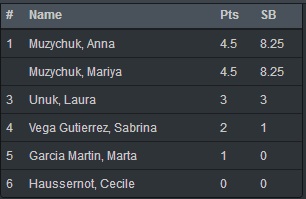 Анна та Марія, зігравши між собою унічию, перемогли усіх своїх суперниць і, з результатом 4,5 очок з 5 можливих, розділили 1-2 місця.