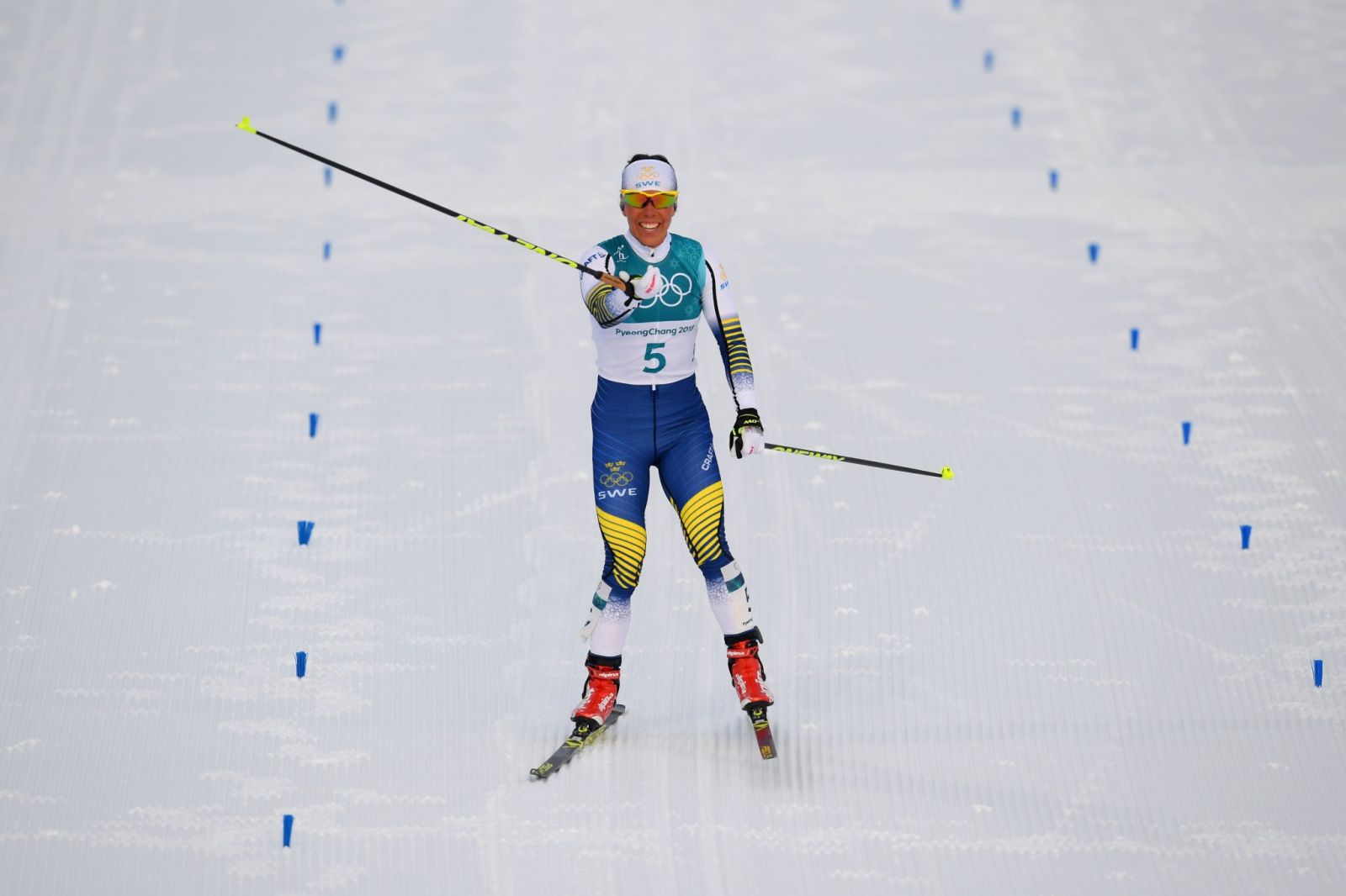 Перший комплект нагород в Пхьончхані був розіграний в жіночому скіатлоні на 15 км (7,5 км класичним стилем + 7,5 км вільним стилем). Шведська лижниця Шарлотт Калла виборола золото, ставши триразовою олімпійською чемпіонкою. Вона показала результат 40 хвилин 44,9 секунди, срібло взяла норвежка Маріт Бьорген, яка програла переможниці +7,8 секунди, бронза у фінки Крісти Пармакоскі (+10,1).