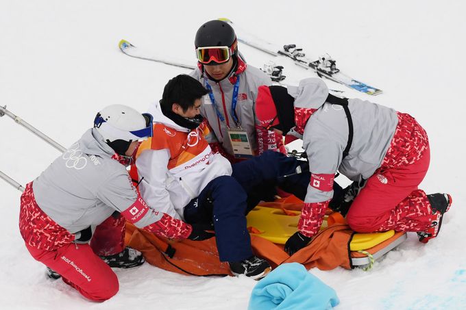 Японский сноубордист Юто Тоцука в сопровождении медицинского персонала после падения с высоты свыше 6 метров.