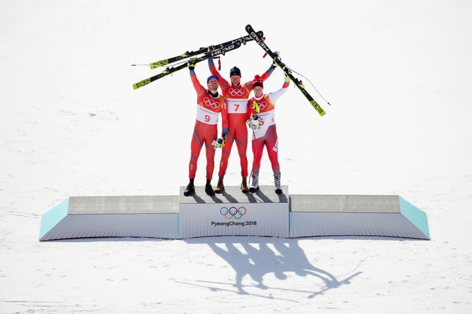 Серебряный призер Олимпиады-2018, горнолыжник Хьетиль Янсруд из Норвегии, золотой медалист Аксель Лунд Свиндаль из Норвегии и бронзовый призер Беат Фойциз Швейцарии.