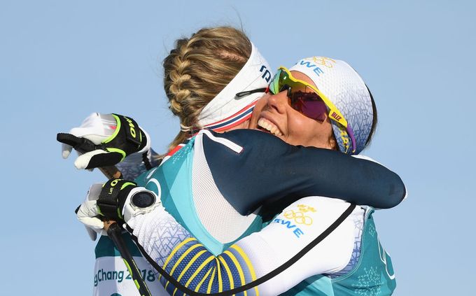 Лыжницы Рагниль Хага из Норвегии и Шарлотт Калла из Швеции