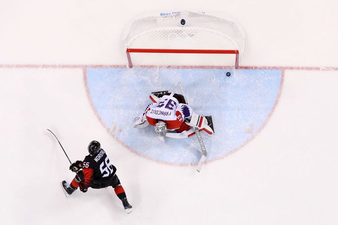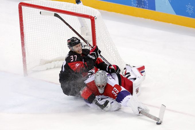 Хоккеист Коди Голаубеф из Канады борется за шайбу