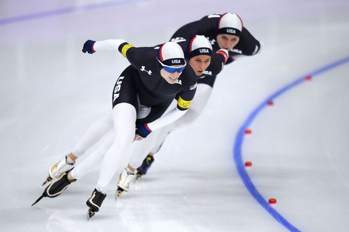 Мия Манганелло, Бриттани Боу и Хизер Бергсма из Соединенных Штатов.