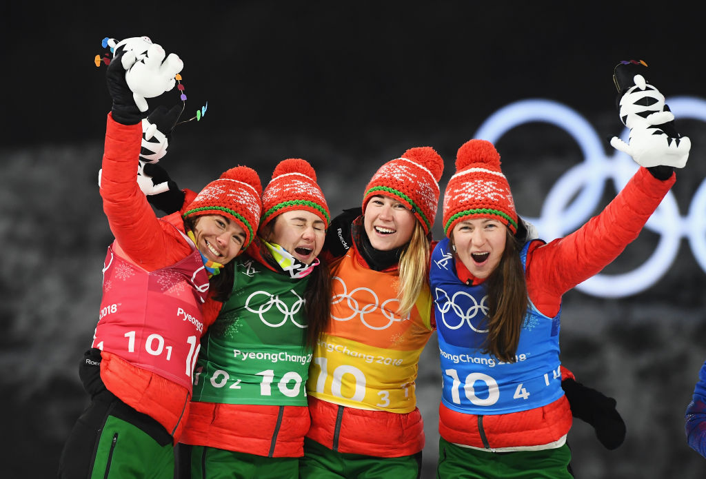 Золотые медалисты Надежда Скардино, Ирина Кривко, Динара Алимбекова и Дарья Домрачева из Беларуси