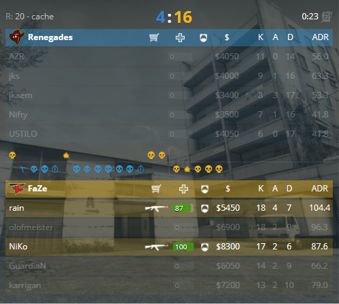 На очереди Faze Clan будут противостоять Renegades. Карты, которые будут сыграны: de_inferno, de_cache и de_mirage. Сильную атаку показывают австралийцы, забирай начальную серию, 0-5. Продолжают набирать раунды террористы, но отдают также, 3-7. Вернулись в игру «галактикос», без шансов забирая оставшиеся пункты, 8-7. Забирая пистолетный, «фейзы» выходят в плюс по счёту на табло, 12-8. Перехват инициативы произошёл в очередной раз, «ковбои» выходят на паритет, 13-13. Задавила атакующая сторона оппонента в последних раундах, 16-13.