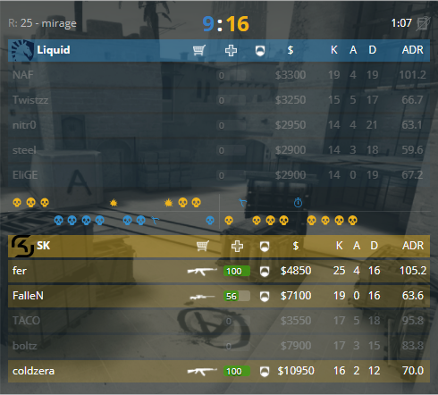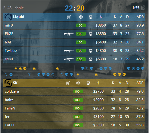 Начинать борьбу за выход в полуфинал предстоит Team Liquid и SK Gaming. В этой встречи будут сыграны: de_mirage, de_cobblestone и de_inferno. Переменное преимущество, - именно так начинается «мираж», 4-4. Очень равная половина от игроков по обе стороны баррикад, 7-8. Набирают серию раундов бразильцы, расшатывая оборону «жидких», 9-13. Не смогли вернутся во второй половине своего пика, 9-16.